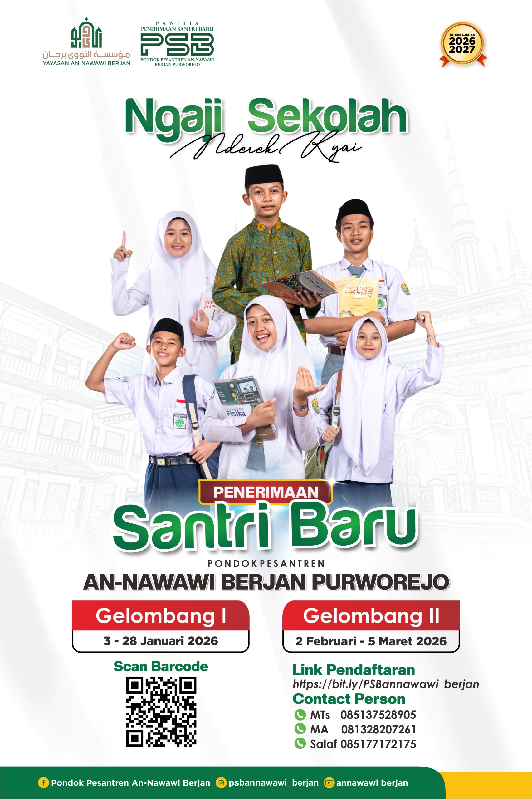 Kabar gembira bagi Bapak/Ibu dan calon santri. Pendaftaran santri baru Pondok Pesantren An-Nawawi Berjan Purworejo untuk Tahun Ajaran 2026/2027 segera dibuka! ✨